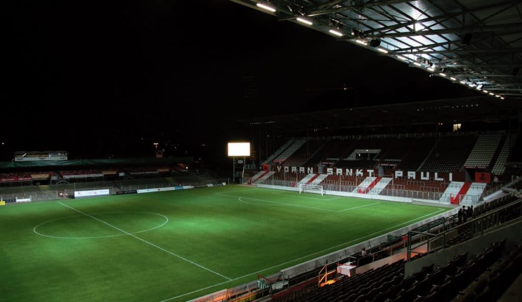 Pauli, it is on the heiligengeistfeld near the reeperbahn, the red light district of hamburg.