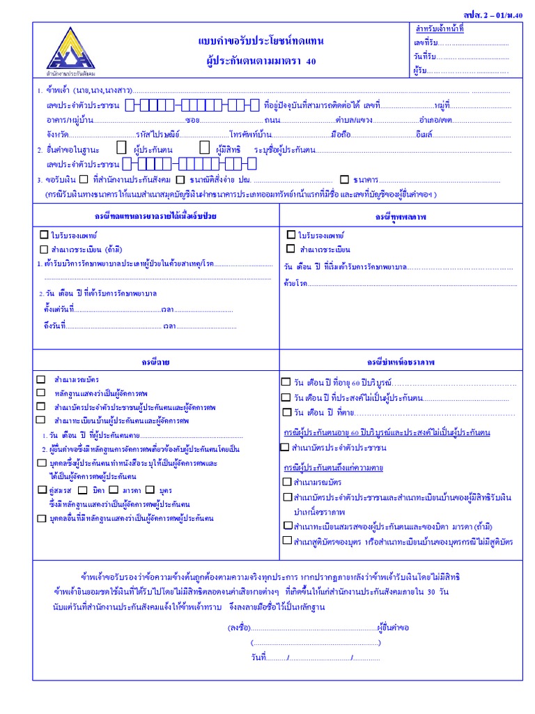 แบบแจ้งความจำนงไม่ประสงค์เป็นผู้ประกันตนตามมาตรา 40 สปส. 1 ... from www.openerpthailand.org Maybe you would like to learn more about one of these? We did not find results for: Check spelling or type a new query.